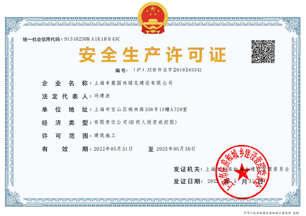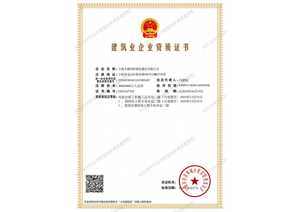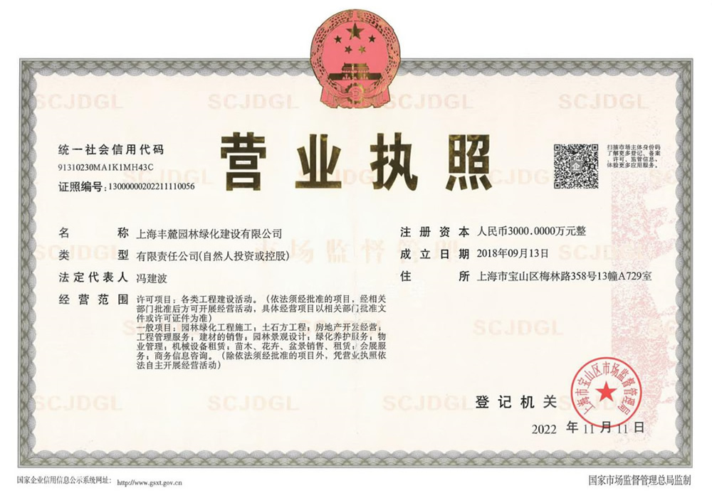 上海豐麓園林綠化建設有限公司注冊資金3000萬元,總部位于上海,成立了第一區域(上海、廣西)工程管理部;第二區域(江蘇、西北)工程管理部;第三區域浙江工程管理部。公司具備園林綠化資質、市政工程二級資質、建筑裝飾裝修二級資質、鋼結構二級資質,擁有多支園林綠化和市政建設的專業隊伍并獲得市級高新和專精特新技術企業認證。
